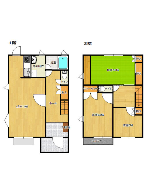 LDK15畳 1階 洋室6.5畳 2階 洋室5畳 2階 和室7.5畳 2階 LDK15・和7.5・洋6.5・洋5 |
